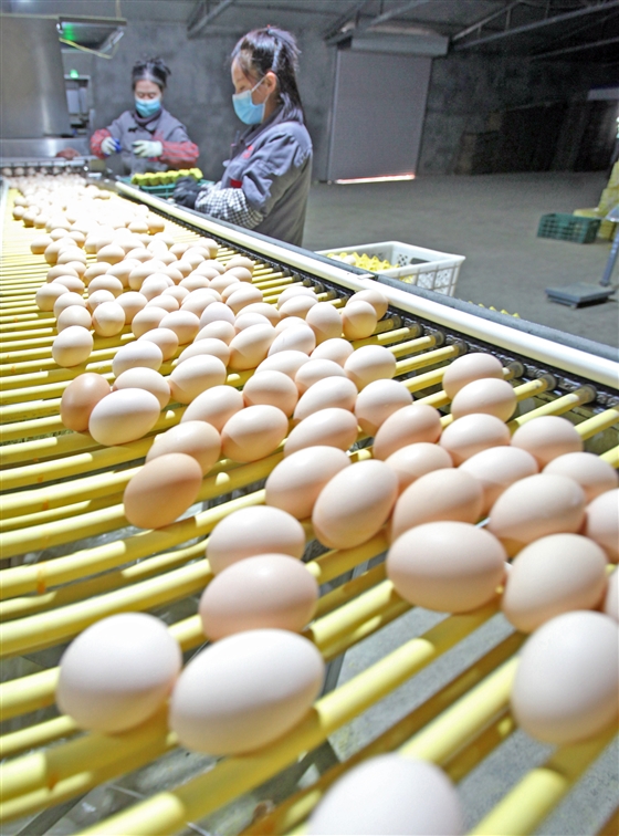 4月20日,和顺县平松乡千禾农业有限公司内,工作人员正在对鸡蛋进行筛选。该公司是当地最大、效益最好的蛋鸡养殖企业,生产的鸡蛋销往晋中及周边地市。为巩固脱贫成效,该企业每年拿出近50万元为全乡8个村近2000名贫困农民分红。本报记者 谢 晋 摄