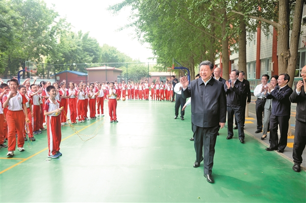 习近平步行察看校园环境。篮球场上学生们正在打篮球、跳绳,上体育课。习近平指出,提高人的健康素质,青少年是黄金期。这个阶段,长身体是第一位的,身体好了,才能为今后一生的学习工作打好基础。体育锻炼是增强少年儿童体质最有效的手段。现在生活条件好了,孩子们不是要吃得胖胖的,而是要长得壮壮的、练得棒棒的。体育锻炼要从小抓起,体育锻炼多一些,“小胖墩”、“小眼镜”就少一些。学校要把体育老师配齐配好,家庭、学校、社会等各方面都要为少年儿童增强体魄创造条件。