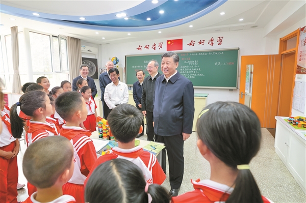 习近平随后来到五年级教师办公室,看望正在研讨备课的老师们,询问课后服务课程结构设置等情况。习近平指出,中国特色社会主义教育体系是好的,我国的基础教育在世界上是有优势的,要坚定文化自信,把自己好的东西坚持好,把国外好的东西借鉴好,与时俱进、开放发展,让孩子们有更广阔的眼界、更开阔的思路、更开放的观念,努力培养堪当民族复兴重任、勇于创造世界奇迹的国之栋梁。习近平强调,人才培养,关键在教师。广大教师要牢记为党育人、为国育才的初心使命,以人民教育家为榜样,以德立身、以德立学、以德施教。要在全社会营造尊师重教的良好风尚,让教师成为最受社会尊重和令人羡慕的职业,努力形成优秀人才争相从教、优秀教师不断涌现的良好局面。