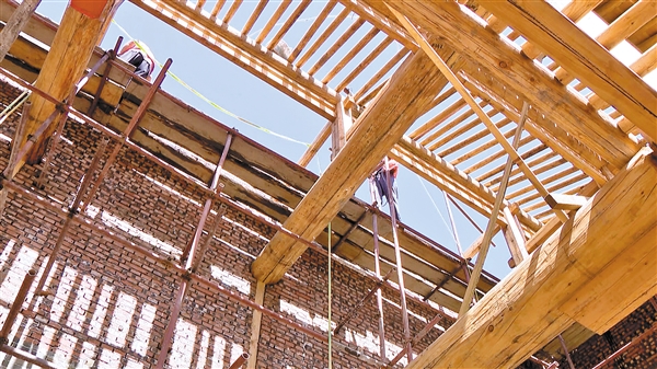 太谷古城是山西省历史文化名城、省级历史文化街区,历史悠久,规模宏大,古城内尚存数百处明清民居,其中保存完整的明清院落有166处。在太谷古城南大街临街商铺修缮施工点,施工现场忙碌而有序,木工、瓦工、土工正专注地做着各自的工作。