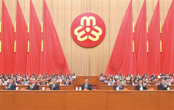 人民大会堂大礼堂气氛庄重热烈。主席台上方悬挂着“中国妇女第十三次全国代表大会”会标,后幕正中是鲜艳的中华全国妇女联合会会徽,10面红旗分列两侧。二楼眺台悬挂着“以习近平新时代中国特色社会主义思想为指导,全面贯彻党的二十大精神,动员引领各族各界妇女为全面建设社会主义现代化国家、全面推进中华民族伟大复兴而团结奋斗!”巨型横幅。