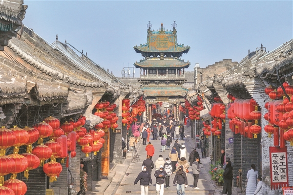 1月11日,游人在大红灯笼高高悬挂的平遥古城游览观光,打卡留念。春节临近,平遥古城景区管理有限公司采取在主要街道与景点悬挂大红灯笼等措施,营造欢庆的节日氛围,喜迎新春。 本报通讯员 梁生仁 摄
