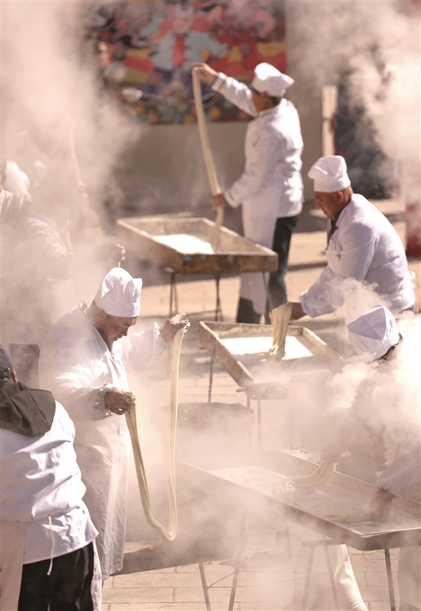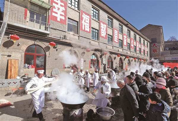 2月7日,昔阳县大寨村柳树广场上水汽蒸腾、拉面翻飞,大寨镇首届“舌尖大寨 寻味之旅”乡村厨艺大赛之拉面比赛火热开场,20余位面点师甩开双臂亮绝活儿,吸引了众多游客和当地群众前来观赛、品尝。为推介乡村文旅产业、展示地方传统美食,大寨镇举办了为期两天的乡村厨艺大赛,进行了烧肉拉面、枣糕、油果、菜汤4个项目的比赛,来自昔阳县各乡镇的10支代表队共100余名厨师和厨艺爱好者积极参与、展示技艺。