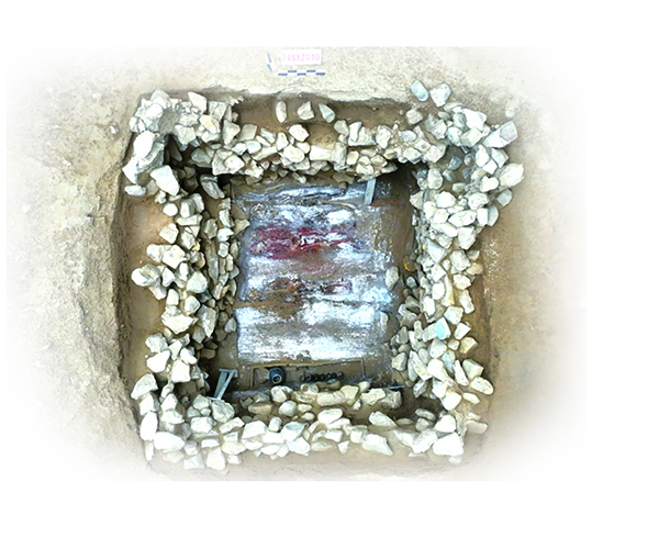 根据墓葬面积及葬具种类,可以将墓葬分为三类。最大的墓编号为M10,长、宽均超过6米,墓室面积达46平方米。墓室为竖穴土坑,有熟土二层台。二层台东、西、南部皆有火烧后黑色灰痕,疑为祭祀痕迹。二层台内有两椁三棺。外面用石块构筑大型石椁,长、宽均达4米,石椁内置木椁,木椁内并列放置三个木棺,棺内各葬一人。中棺内为男性,身体涂有朱砂,头顶覆有扇贝,男性墓主人右侧股骨位置有一件由绿松石嵌片组成的绿松石牌饰。陪葬的女性位于两侧,身体涂的朱砂较薄,无随葬品。北壁有壁龛,龛内殉葬有一名男性。椁室内北侧有一个长方形器物箱,随葬有漆木器、陶斝和陶罐。