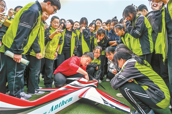 4月11日,平遥中学举办以“追梦科技·志在长空”为主题的航模飞行表演,邀请南京航空航天大学航模表演队为全校师生献上“固定翼花式飞行、纸飞机特技飞行、遥控飞盘特技飞行”等精彩的航模表演,让科技与青春在蓝天碰撞,激发学生们“科技强国”“航空报国”的理想与激情。图为表演队成员向学生们讲解航模飞行原理。