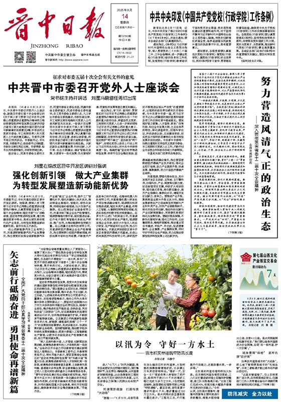 本报讯 (记者王文安)8月13日,中共晋中市委召开党外人士座谈会,就提交市委五届十次全会审议的《关于深入学习贯彻习近平总书记考察山西重要讲话重要指示精神努力推动资源型经济转型发展迈出新步伐奋力谱写三晋大地推进中国式现代化晋中新篇章的实施意见》稿,听取各民主党派市委会、市工商联负责人和无党派人士代表的意见建议。市委书记常书铭主持并讲话。市委副书记、市长刘星,市委副书记、政法委书记冯晓雷,市政协主席任秀红出席。市委常委、秘书长刘伟通报情况,市领导贡琦出席。