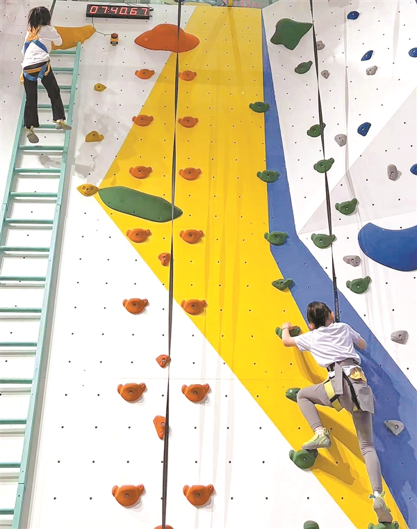 8月15日,市城区一家攀岩馆内,小朋友在体验攀岩运动。暑假期间,孩子们通过参加丰富多彩的文化体育活动,让假期生活更加充实。