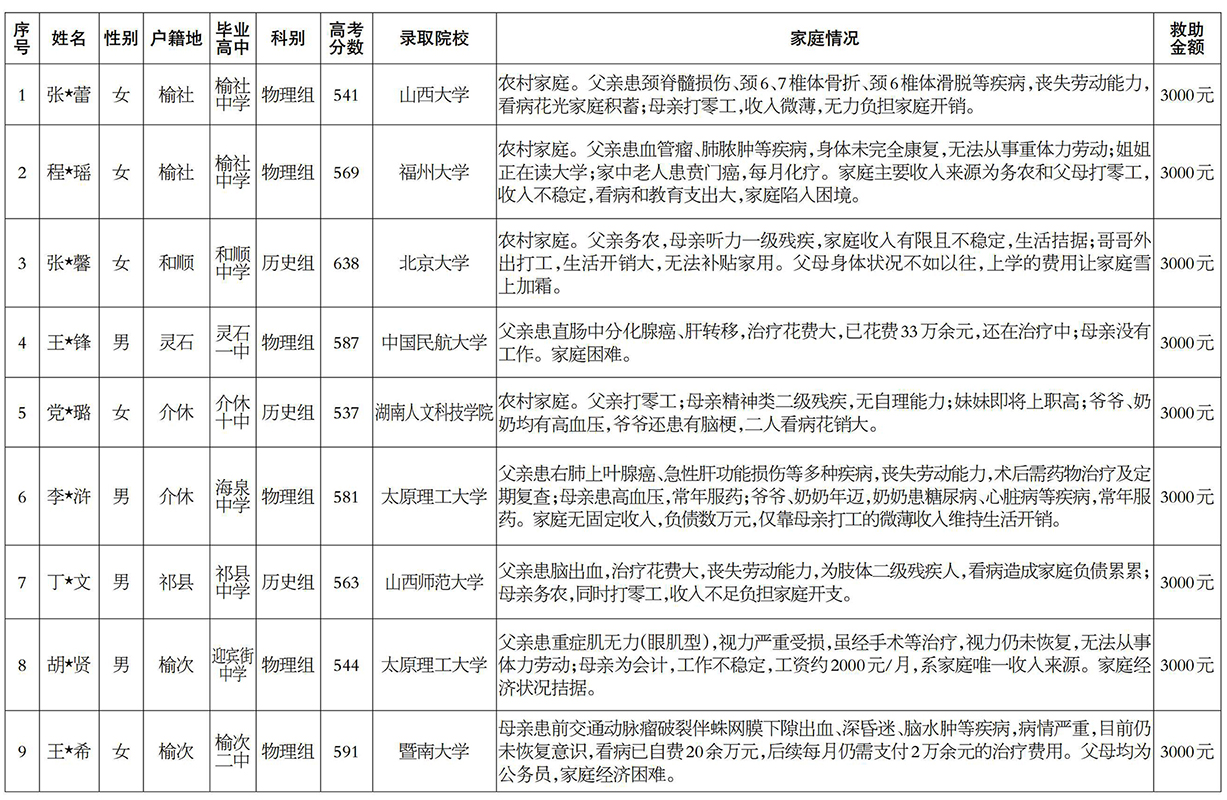 现将拟救助的9名学生的基本情况进行公示,并主动接受社会各界的监督。公示时间为3个自然日,期间如发现学生申报情况不实,或已得到其他组织5000元(含)以上救助,晋中市红十字会将据实取消救助。
