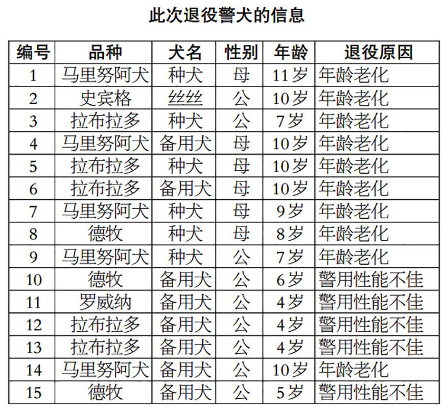 警犬依靠敏锐的嗅觉和无畏的勇气,在进行刑事侦查、缉毒、公共安全等公安工作中能起到意想不到的作用。然而随着狗狗岁数的增长,身体素质各方面都已呈下降趋势,再厉害的它也有要退役的一天……