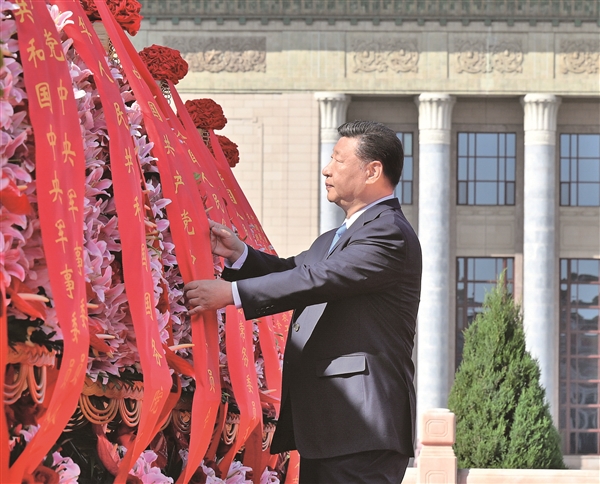 习近平迈步上前,仔细整理花篮缎带。随后,习近平等党和国家领导人缓步绕行,瞻仰人民英雄纪念碑。