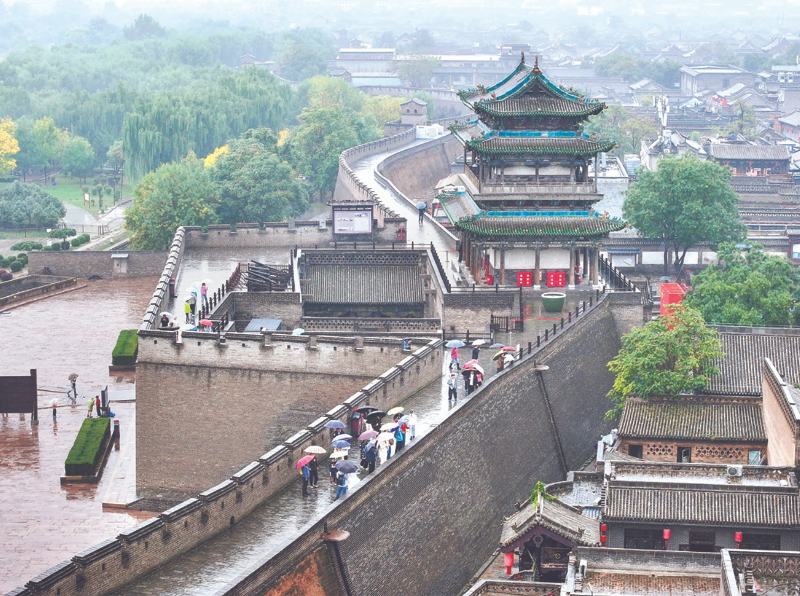 雨中的平遥古城,游人伞下漫步体验别样风情。 |