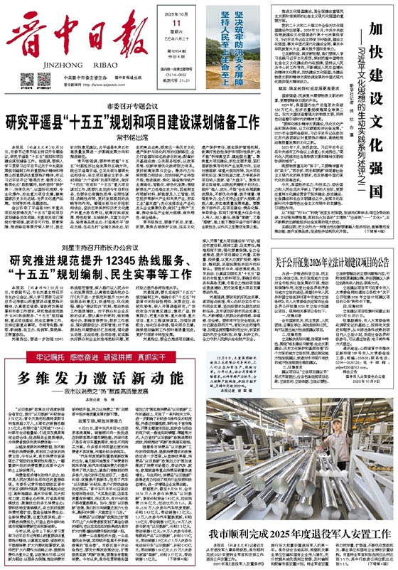 市委副书记、市长刘星在全市8月份经济运行分析会上指出,要推动消费升级扩容,紧抓“金秋消费季”,用好消费品“以旧换新”等政策,推出更多促销活动,有效发挥杠杆效应,最大限度激发消费活力;要做好国庆、中秋文旅工作,抢抓旅游消费黄金期,从旅游供给侧入手,进一步强化宣传引流、丰富旅游场景、抓细服务保障,从细微之处呵护“旅游满意在晋中”服务品牌。