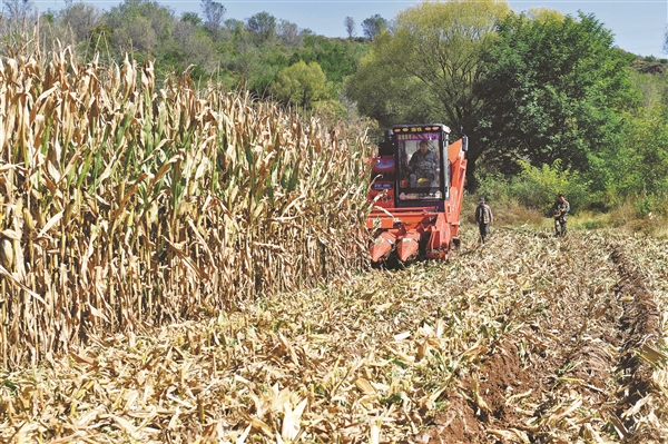 十月十三日,玉米收割机在和顺县义兴镇科举村的种植地里往返作业,抢收玉米。本报记者 杨 洋 摄