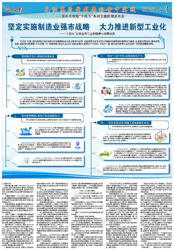 “十四五”时期,我市坚持以习近平新时代中国特色社会主义思想为指导,全面贯彻习近平总书记考察山西重要讲话重要指示精神,认真落实党中央、国务院及省委、省政府决策部署,大力实施“156”战略举措,推动工业立市、制造业强市、新质生产力兴市,与各方一道,推动全市新型工业化取得一系列新进展新成效。