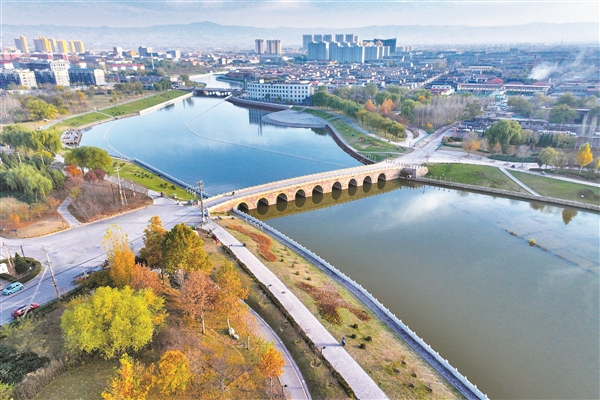 11月11日,流经平遥县城的惠济河蜿蜒清澈,与平遥古城遥相呼应,与县域道路、高楼民宅、小岛廊桥等相依相映,勾勒出一幅自然之美与人文景观相融共生的美丽画卷,再现古景“河桥野望”。