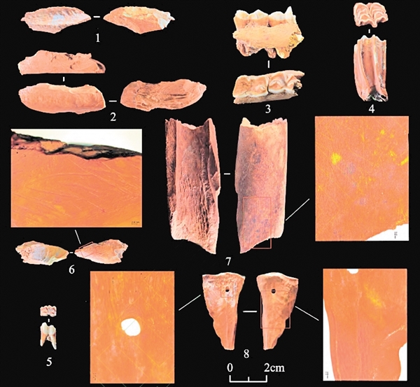 在文化遗存方面,此次发现的骨器、装饰品及刻划骨片尤为引人关注。一件以动物肢骨制成的三角形装饰品,表面可见钻孔与磨光痕迹,可能为佩饰;另有两件骨片表面分布有多条刻划痕,形态规整,可能具有符号意义。这些遗存被视为早期现代人精神象征行为的重要体现。