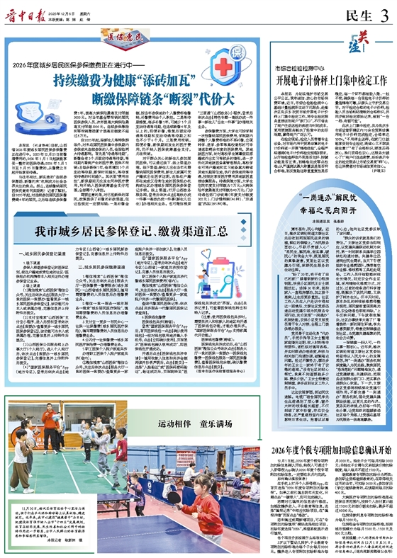 本报讯 (记者郭娟)目前,山西省2026年度城乡居民医保参保缴费正在进行中。2025年12月25日前缴清费用的,2026 年 1 月 1 日起就能享受一整年的医保待遇;2026 年 1 月 1 日至 2 月 25 日缴费的,从缴费之日起开始享受待遇。
