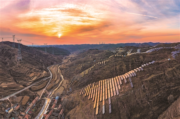 12月5日,左权县石匣乡高马沟的太行山巅,晚霞为连绵的光伏板镀上金辉,不远处玉带般的太行一号旅游公路蜿蜒起伏,二者遥相呼应,构成一幅科技与自然交融的冬日画卷。本报通讯员 张文军 摄