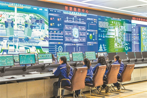 12月9日,平遥一矿焦化有限公司智慧集控中心,技术人员正对生产、安全、环保及供应销售等进行实时监控。