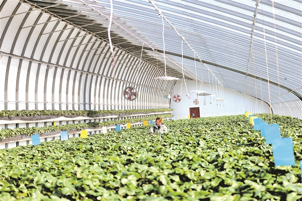 草莓大棚内,工作人员正仔细查看草莓长势