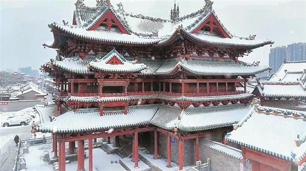 12月12日,今冬第一场雪悄然而至,介休市街道、树木和古建,都披上一层薄薄的雪衣。古韵建筑与现代化的介休城交相辉映、美不胜收。 李心瑶 侯学涛 摄