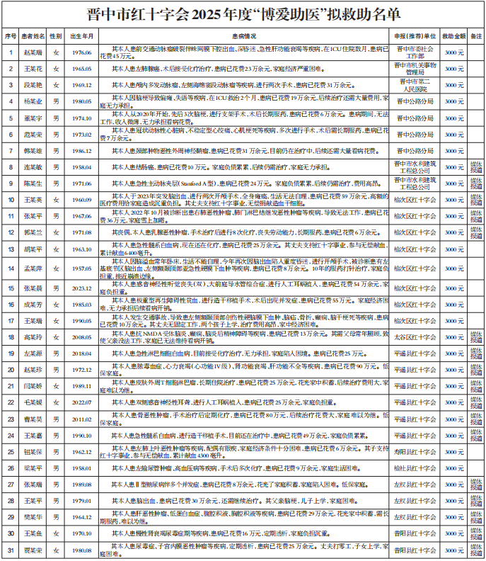 晋中市红十字会2025年度“博爱助医”拟救助名单公示