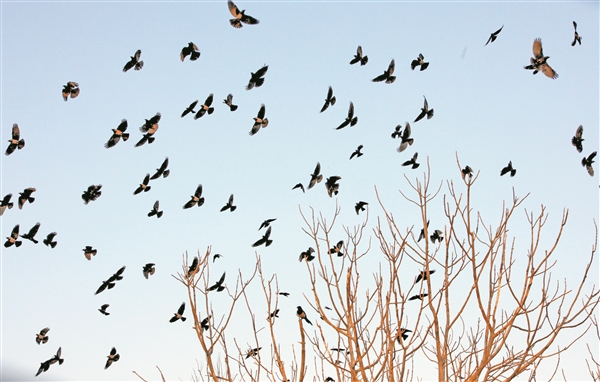 太谷区北洸乡曹庄村南的一片树林上空,成千上万只鸟儿尽情飞舞