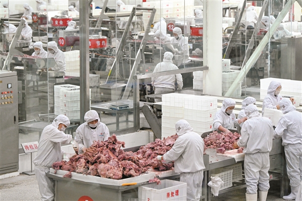 1月12日,在山西平遥牛肉集团有限公司生产车间,工人正在加紧生产“一口香”订单产品。近年来,该公司引进先进生产设备,研发生产多规格、多样化、具有传统文化特色的产品,满足不同层次消费者需求,进一步抢占市场份额。本报通讯员 梁生仁 摄