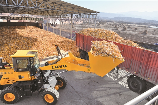 近日,左权县寒王乡安庆荣农机专业合作社大院内,金灿灿的玉米堆积如山,大卡车正在排队装车,将玉米销往河南、河北等地。近年来,该合作社采取机械化作业、科学种植的方式,形成高效现代农业产业体系,粮食产量连年丰收,带动全村280户农民增收致富。 本报通讯员 刘永红 摄
