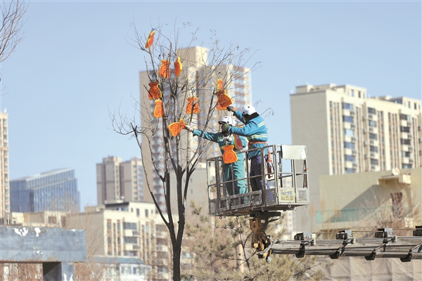 工作人员将“福袋”彩灯挂在行道树枝头 祥和喜庆的氛围扑面而来