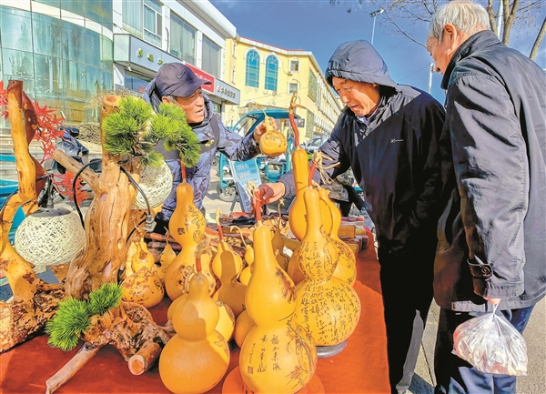 1月10日,左权县王家庄村农民曹志强在街头销售葫芦烫画等农家艺术产品。曹志强是远近闻名的“农民艺术家”,他将农村特有的葫芦和崖柏、桃木等传统产品,通过手工艺技术制成艺术品,增加了产品附加值,吸引游客参与乡村体验,形成“艺术+农业”的产业链,为农民增收闯出一条新门路。 本报通讯员 邢兰富 摄