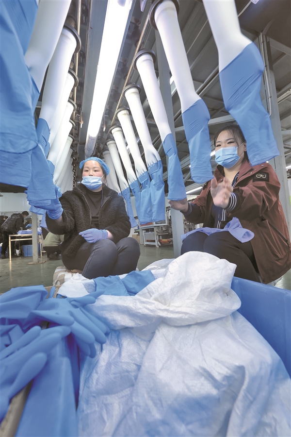 左权县乳胶产业园星荣科技有限公司年产60亿只丁腈手套项目,计划总投资9亿元,占地123亩,分三年三期实施。目前,项目一期8条单线建设完成,其中4条已开始试运行。待项目全部建成投产后,年可生产丁腈手套60亿只,年销售收入15亿元,税收 8000万元,并可新增就业岗位1200个。图为该企业生产现场。本报记者 裴晓军 摄