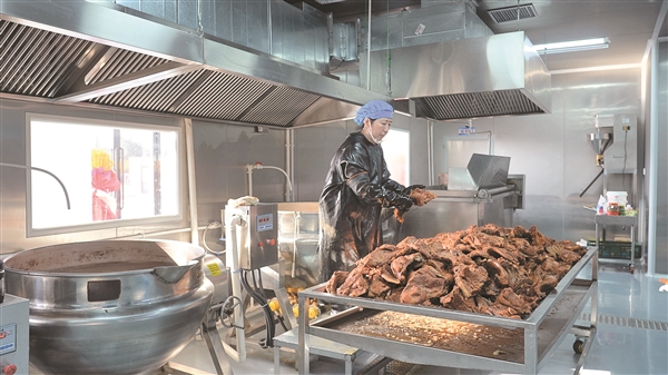 “我是洪山村地地道道的家庭妇女,寒冬农闲时来车间切肉、摆盘,一个月能挣1000多元,活儿也清闲。我们用的肉干净又卫生,欢迎大家前来品尝。”员工石灵秀说。