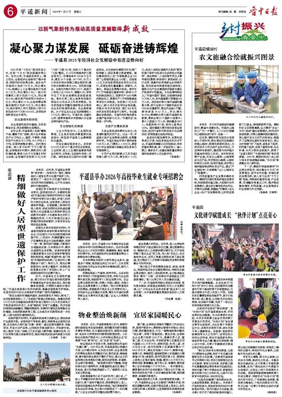 去年以来,平遥县深入实施“藏粮于地、藏粮于技”战略,预计全年粮食总产20万吨以上,蔬菜、干鲜果、肉蛋奶总产分别为19.5万吨、18.3万吨、9.5万吨,实现持续稳定增长。农村更加宜居。深入学习运用“千万工程”经验,全面推进乡村振兴,聚焦农村人居环境改善,筹资1300万元完善乡村环卫设施,全面铺开总投资2.3亿元的“六改”工程102项,完成15个重点村“三线”整治。仁义引水维修养护工程全面完工,年增地表水500余万立方米;惠及10个乡镇、145个村、22万人口的农村供水保障工程全面投用;集中供水规模化率达63%。农民更加富足。实施乡村振兴项目121个,脱贫户人均收入达15424元,增幅8.3%,牢牢守住了不发生规模性返贫致贫底线。香乐乡第二轮土地承包到期后再延长30年试点工作有序推进。住宅类房屋专项整治国家级试点得到农业农村部通报表扬。农业高质高效。39户农业龙头企业完成销售收入111亿元,增长7%。平遥牛肉、岳壁长山药、国青鸡蛋再次年度确认为全国名特优新农产品。