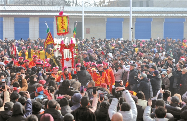1月26日,农历腊月初八,榆次北六堡村传承数百年的“抬冰山”非遗民俗活动如期上演,拉开年节序幕。当日,北六堡村内锣鼓喧天、笙管齐奏,村民们以独特的“抬冰山”民俗活动喜庆丰收,祈求风调雨顺、人寿年丰,文艺游行队伍则载歌载舞,热火朝天为“抬冰山”民俗活动助兴增趣。众多闻名而来的观众和游客吃冰祈福,感受非遗魅力。本报记者 裴晓军 摄
