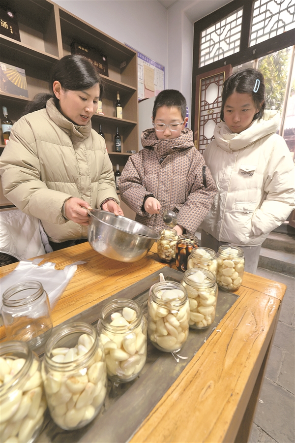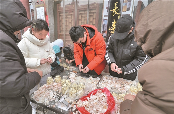 1月25日,太谷区群众在太谷古城景区参加腊八蒜制作体验活动。景区内一家中医药馆开展传统民俗亲子体验活动,为参与活动的中小学生及家长提供原材料,由他们共同完成剥蒜皮、灌醋装瓶等工序。参与者每灌装5瓶腊八蒜即可获赠1瓶,以此鼓励孩子们在劳动中感受传统文化魅力。本报记者 裴晓军 摄