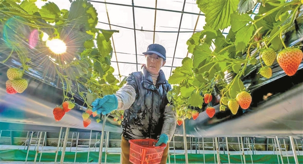 1月20日,左权县马厩村草莓园里生机盎然,农场员工正在采摘新鲜草莓。近年来,该草莓园坚持“立体种植+休闲采摘”模式,采用无土栽培技术及科学管护,提高草莓产量和品质,带动农民增收。
