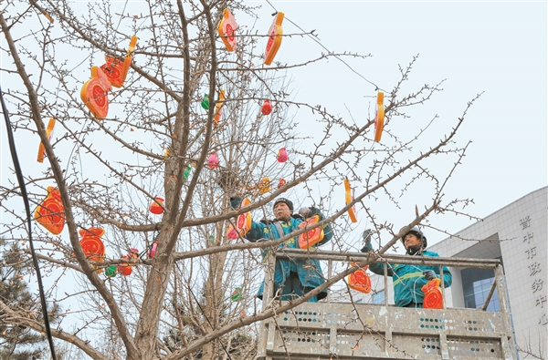 上图:市场里处处洋溢着浓浓的烟火气与热闹年味。下图:工作人员将彩灯挂上枝头,为即将到来的新春增添亮色。 耿新洲 摄