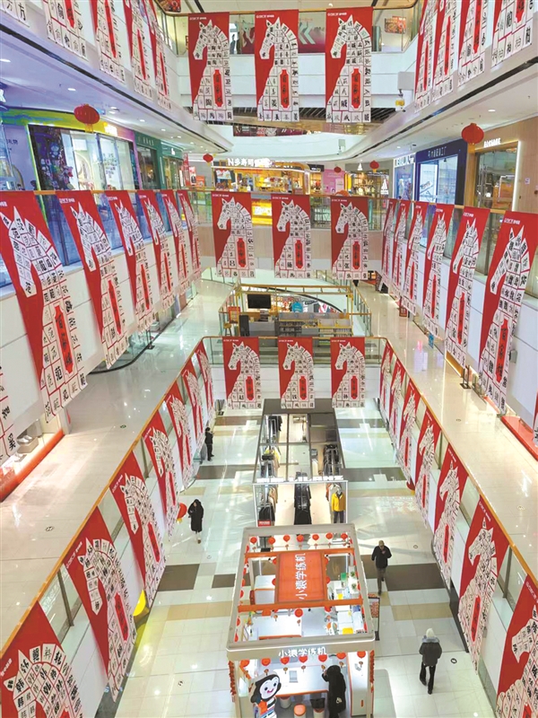1月30日,在市城区新建万达广场,马年百家姓主题节庆装饰精致亮相,为商场添彩增辉。进入腊月,我市各大商场年味十足,马年主题的喜庆装扮随处可见,浓郁的新春氛围扑面而来。 本报记者 肖彦谦 摄