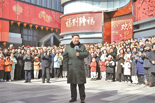正值农历小年,隆福大厦前,新春市集吸引了大量市民和游客。习近平饶有兴致察看各式年货摊位,同现场群众亲切交流。他愉快地向大家讲起年少时多次到隆福寺的情景,还购买了几份特色食品和文创产品。
