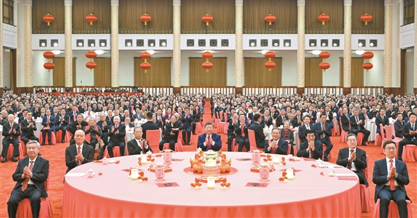 人民大会堂宴会厅灯光璀璨、喜气洋洋,各界人士2000多人欢聚一堂、共迎佳节,现场洋溢着欢乐祥和的节日气氛。