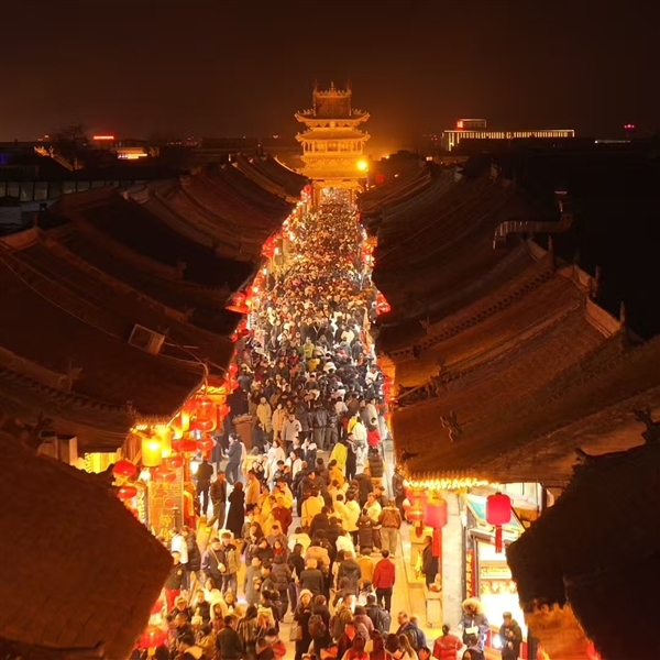 2026平遥中国年期间,平遥古城处处张灯结彩、年味浓郁,气势磅礴的鼓乐,欢腾奔放的高跷,欢快喜庆的花鼓,扣人心弦的杂技等,一个个来自全国各地的节目轮番上演,精湛的技艺赢得现场观众阵阵掌声与喝彩。平遥电影宫内“非遗中国年 春节嘉年华”更是热闹非凡,大型主题灯组流光溢彩,非遗展演与巡游互动深度融合,吸引全国各地游客前来打卡体验,共赴一场传统与新潮交织的新春盛宴。