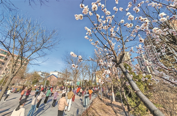 春风送暖,万物复苏。3月19日,市城区蕴华街口袋公园夏雨园内繁花初绽,粉白的花朵在澄澈蓝天的映衬下格外明媚,不少市民趁着晴好天气来到园内锻炼健身,尽显春日生机与城市活力。 本报记者 张浩亮 摄