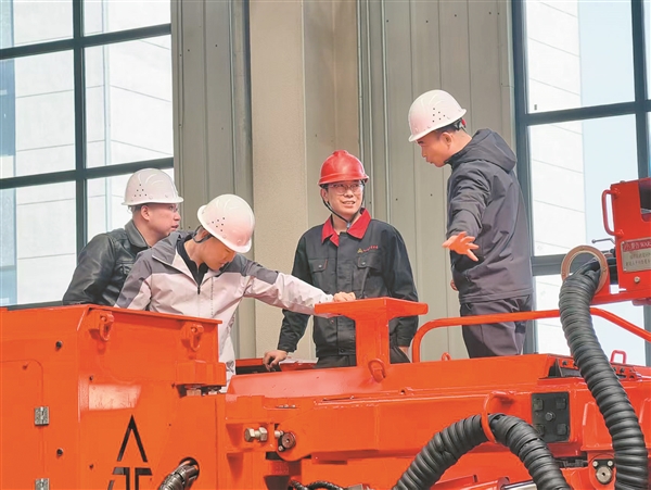 生产一线高效运转的同时,产品交付也在紧锣密鼓推进。在EBZ260型掘进机前,技术人员正为到访的矿方客户进行现场讲解与操作演示。客户围绕设备性能、运行参数等关键环节逐一核验,确保设备精准适配矿井实际需求,顺利投入使用。