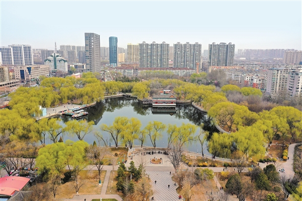 3月26日,市城区玉湖公园在春日暖阳下尽显生机,园内碧水、古建与柳树相映成趣,市民们健身、悠闲漫步,踏春赏景,感受春天的气息。本报记者 刘 勇 摄