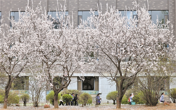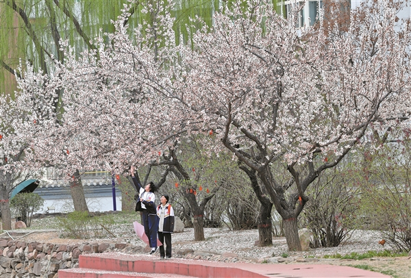 3月31日,榆次一中校园内杏花绽放,学生们穿行其中,尽显青春朝气。四月的校园,碧桃染红,海棠怒放,迎春花渐渐淡了色彩,玉兰花露出了淡淡的粉,不用寻,皆是景,不用嗅,亦含香。