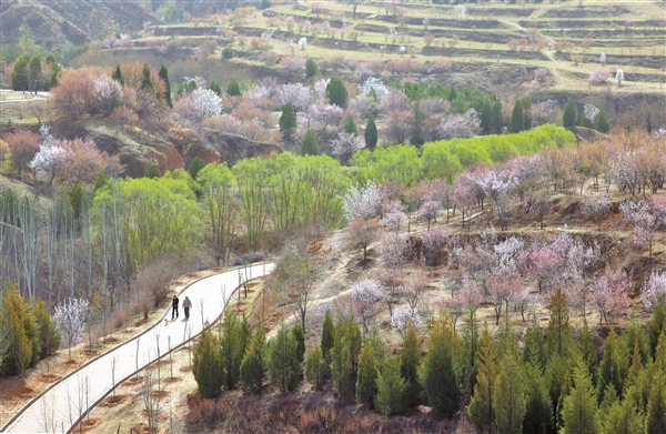 近日,百草坡森林植物园山桃花、杏花竞相绽放,粉白花海漫山遍野,与新绿林木相映成趣。市民徜徉其间,踏青赏春,感受春日之韵。本报记者 刘 勇 摄