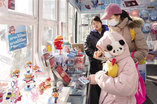 | 游客在哈尔滨一家亚冬会特许商品零售店里挑选文创产品 |