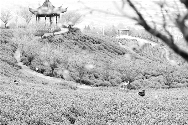 2月17日,湖北省秭归县茅坪镇建东村村民在生态茶园加挂黄色诱虫板。