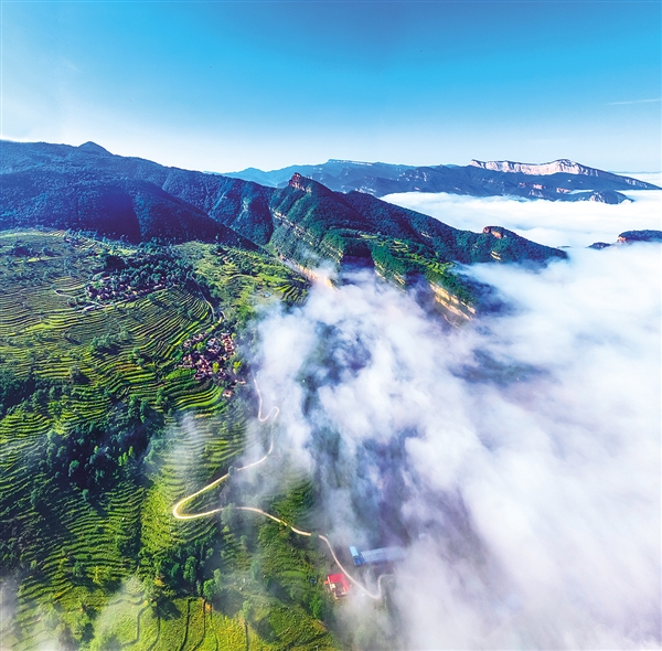 近日,一场秋雨过后,天空放晴。在左权县的太行山中段主峰——孟信脑境内,一场壮阔的云海奇观悄然铺展:云涛翻涌,雾气氤氲,宛如流动的纱幔缠绕山峦。抬眼望去,巍巍群峰在云雾间若隐若现,时隐时露的村庄与层层叠叠的梯田秋色相映成趣,蜿蜒的农村公路如丝带般穿梭其间,与漫山的生态美景共同绘就一幅“云上太行”的仙境画卷,令人心醉神迷,流连忘返,不禁赞叹大自然的神奇笔触。